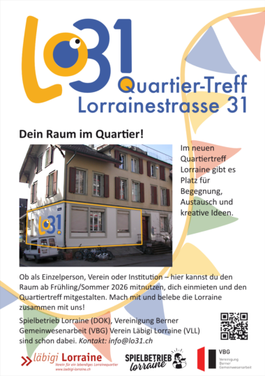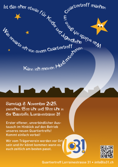 Samstag, 8. November 2025, zwischen 15.00 Uhr und 19.00 Uhr in der Baustelle, Lorrainestrasse 31 Erster offener, unverbindlicher Austausch im Hinblick auf den Betrieb unseres neuen Quartiertreffs! Kommt einfach vorbei! Wir vom Trägerverein werden vor Ort sein und ihr könnt kommen wann es euch zeitlich am besten passt. Quartiertreff Lorrainestrasse 31 • info@lo31.ch • MEHR